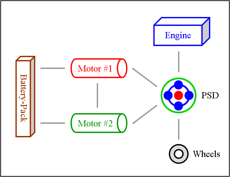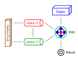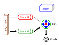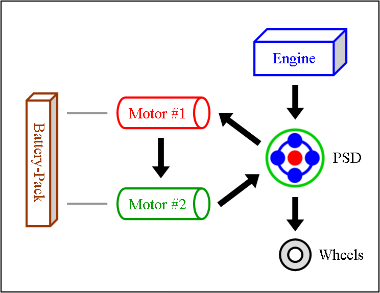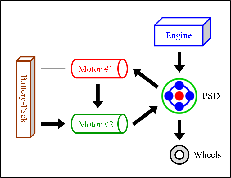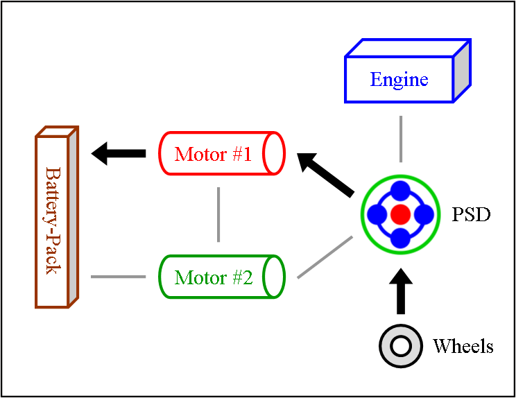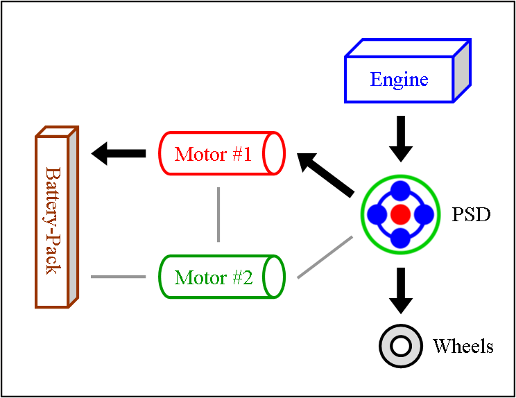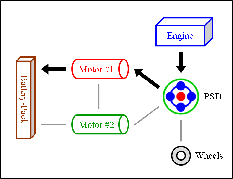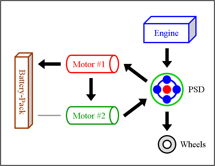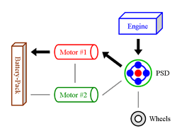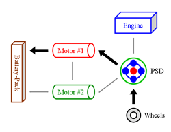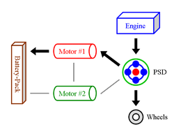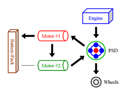 Engine & Motor Drive This is when all components of the “full” hybrid system except the battery-pack provide power. The engine spins the PSD, which then distributes 72 % of that thrust to the wheels and 28 % to the small motor. The spinning of the small motor generates electricity, which is immediately used by the large motor to supply additional thrust to the wheels. The benefit of this seemingly cumbersome distribution comes from the engine operating at a very efficient RPM while at the same time allowing the powerful yet efficient motor to contribute thrust. It also ensures longer battery-pack life by simply not using it. |